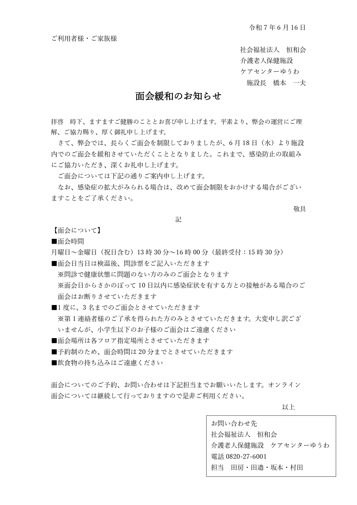 介護老人保健施設ケアセンターゆうわの面会緩和について