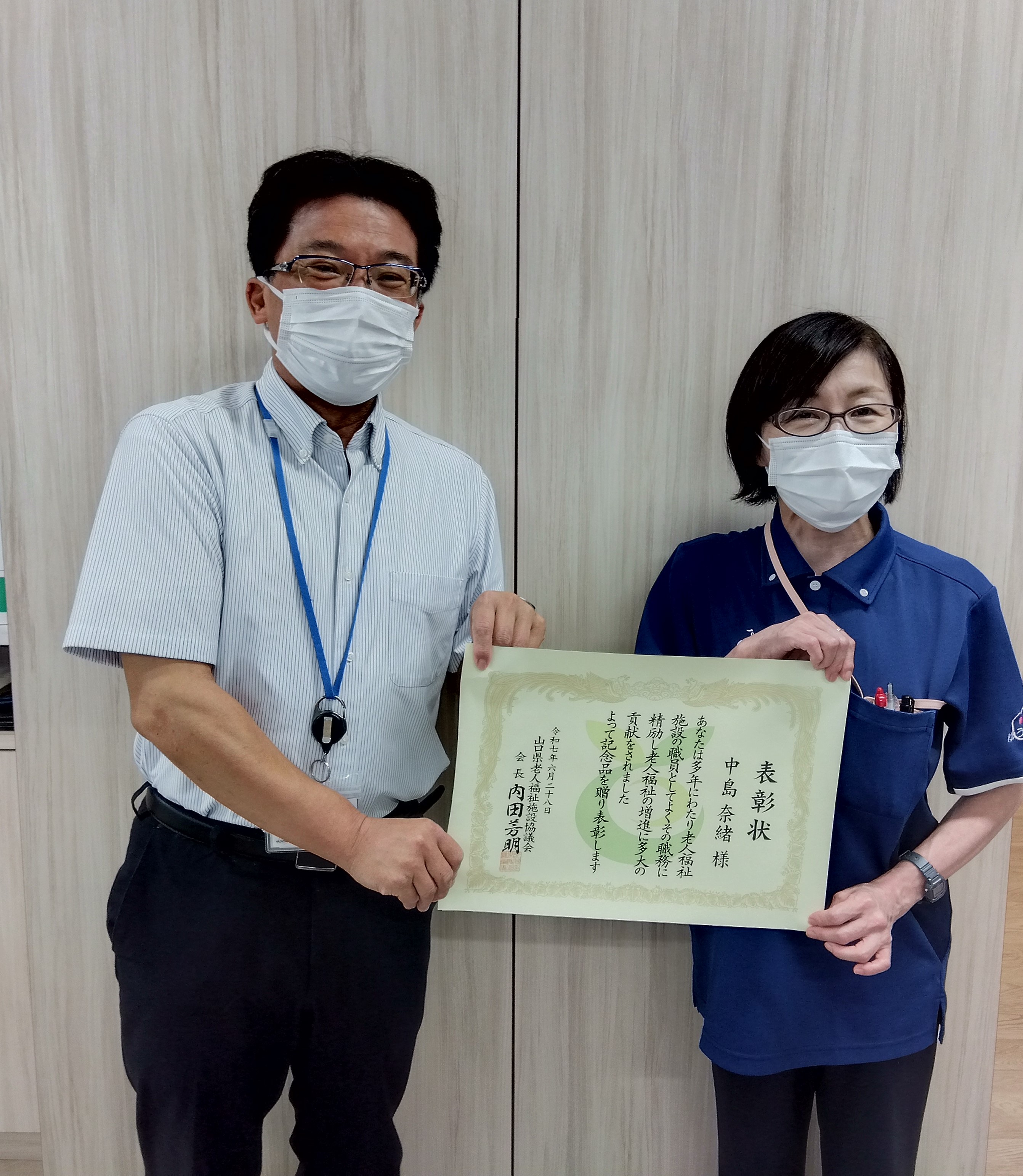 2025.08.14重要なお知らせ 山口県老人福祉施設協議会 会長表彰🏆 老人福祉の増進に寄与または協力し、その功績が顕著なものに対して表彰される、山口県老人福祉施設協議会会長表彰に以下の職員が選出されました! ケアハウス 五味主幹、サンリンク 中島主任、法人本部 佐伯さん、通所リハビリ 矢野主任、デイサービス 川口課長、デイサービス 浅井主任、栄養管理課 河村チーフ おめでとうございます🏆👏✨ 中島主任には上司の西依課長から、表彰状と記念品が渡されました💐頑張っている人が表彰されると、こちらまでうれしく、誇らしい気持ちになりますね☺